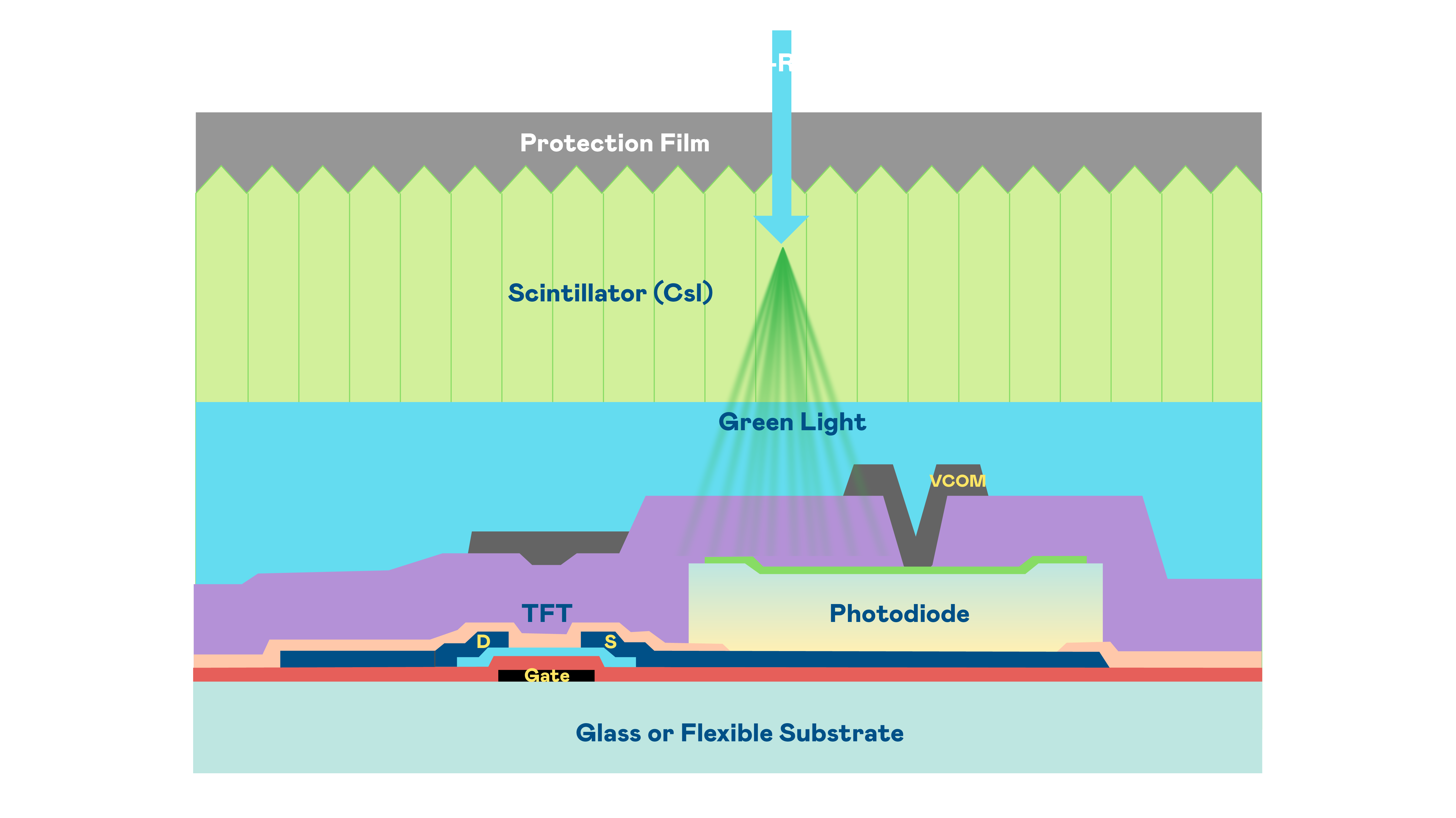 尊龙时凯的X光影像感測陣列使用薄膜電晶體 (TFT) 作為每個像素的讀取開關,搭配光電二極體(Photodiode)的光電轉換元件,用以感測X光影像訊號。